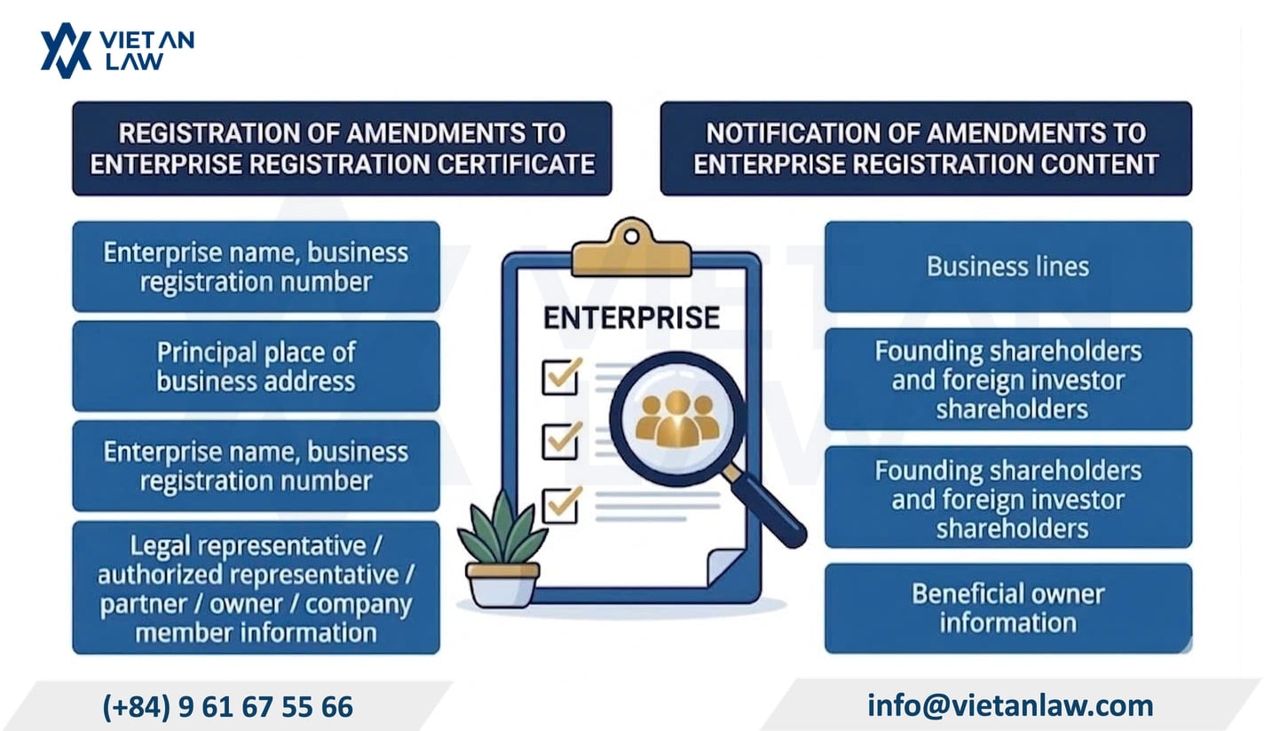 Enterprises must register with the Business Registration Authority when changing the contents of the Enterprise Registration Certificate specified in Article 28 of the Law on Enterprise 2020, amended in 2025, including: