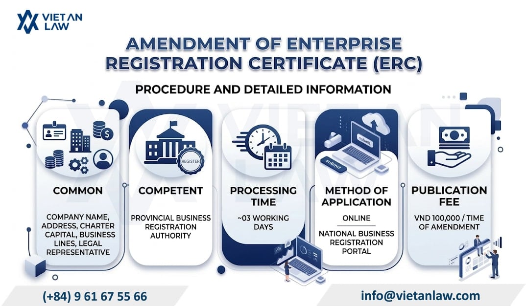 This article by Viet An Law provides a guide on Enterprise Registration Certificate (ERC) amendment procedures in Vietnam, including cases requiring amendment, required documents, procedures, processing time, and important legal considerations for enterprises.