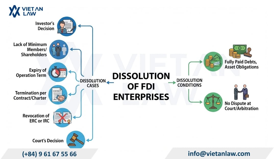 Dissolving a foreign-invested company (FDI) is a procedure that terminates the legal existence of an economic organization with foreign investment capital, requiring strict compliance with the regulations in the Company Law and the Investment Law. This process not only includes terminating the investment project but also involves complex obligations regarding tax settlement, asset liquidation, and resolving employee rights. Through the article below, Viet An Law Firm would like to provide clients with important legal information to support investors in carrying out the FDI company dissolution in Vietnam: A Complete Legal guide.